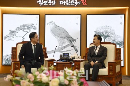 이장우 대전시장(왼쪽)과 김태흠 충남지사가 24일 충남도청사에서 양 시도의 행정통합에 대해 의견을 교환하고 있다. (사진=충남도 제공) |