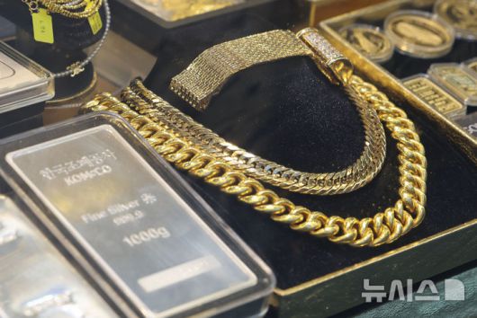 [서울=뉴시스] 권창회 기자 = 금과 은 등 귀금속 가격이 사상 최고치를 경신한 가운데 25일 서울 종로구 귀금속 상가에 금 장신구와 실버바가 진열되어 있다.