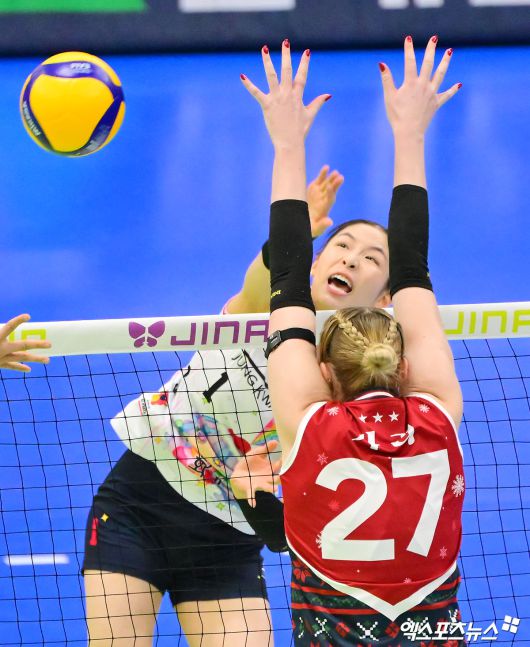 (엑스포츠뉴스 수원, 김한준 기자) 25일 오후 경기도 수원실내체육관에서 열린 '진에어 2025-2026 V-리그' 현대건설과 정관장의 경기, 정관장 인쿠시가 공격을 시도하고 있다.김한준 기자 kowel@xportsnews.com