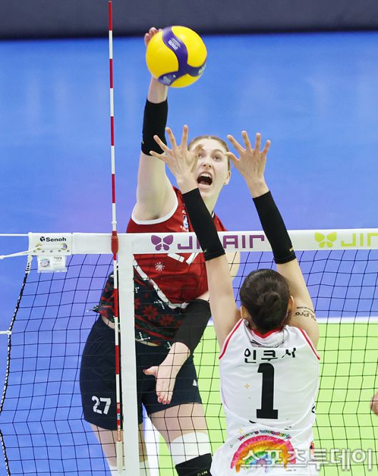 [수원(경기)=스포츠투데이 권광일 기자] 2025-2026 진에어 V-리그 여자부 현대건설과 정관장의 경기가 25일 경기도 수원시 수원체육관에서 열렸다. 현대건설 카리가 공격을 하고 있다. 2025.12.25. [스포츠투데이 권광일 기자 sports@stoo.com]