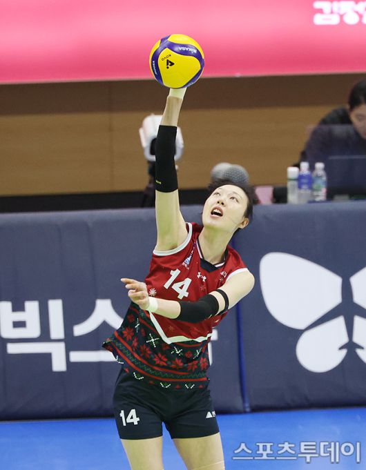 [수원(경기)=스포츠투데이 권광일 기자] 2025-2026 진에어 V-리그 여자부 현대건설과 정관장의 경기가 25일 경기도 수원시 수원체육관에서 열렸다. 현대건설 양효진이 서브를 넣고 있다. 2025.12.25. [스포츠투데이 권광일 기자 sports@stoo.com]