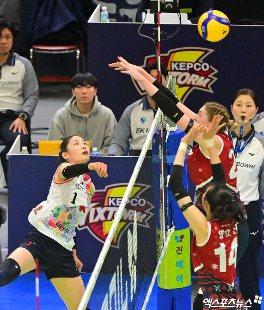 (엑스포츠뉴스 수원, 김한준 기자) 25일 오후 경기도 수원실내체육관에서 열린 '진에어 2025-2026 V-리그' 현대건설과 정관장의 경기, 정관장 인쿠시가 공격을 시도하고 있다.