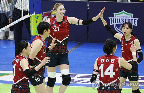 (수원=연합뉴스) 홍기원 기자 = 25일 경기도 수원실내체육관에서 열린 프로배구 V리그 여자부 현대건설 힐스테이트와 정관장 레드스파크스의 경기. 득점에 성공한 현대건설 선수들이 기뻐하고 있다. 2025.12.25
