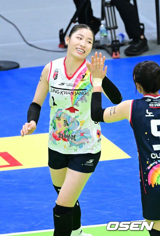 [OSEN=수원, 최규한 기자] 25일 경기도 수원체육관에서 ‘진에어 2025~2026 프로배구 V리그’ 여자부 현대건설과 정관장의 경기가 열렸다. 홈팀 현대건설은 11승 6패 승점 34, 방문팀 정관장은 5승 11패 승점 14를 마크하고 있다. 1세트, 정관장 인쿠시가 득점에 기뻐하고 있다. 2025.12.25 / dreamer@osen.co.kr