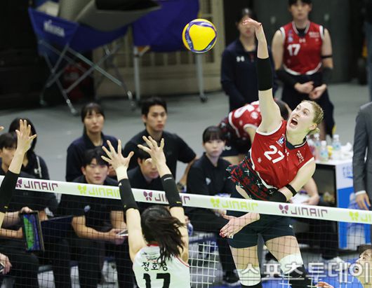 [수원(경기)=스포츠투데이 권광일 기자] 2025-2026 진에어 V-리그 여자부 현대건설과 정관장의 경기가 25일 경기도 수원시 수원체육관에서 열렸다. 현대건설 카리가 스파이크를 때리고 있다. 2025.12.25. [스포츠투데이 권광일 기자 sports@stoo.com]