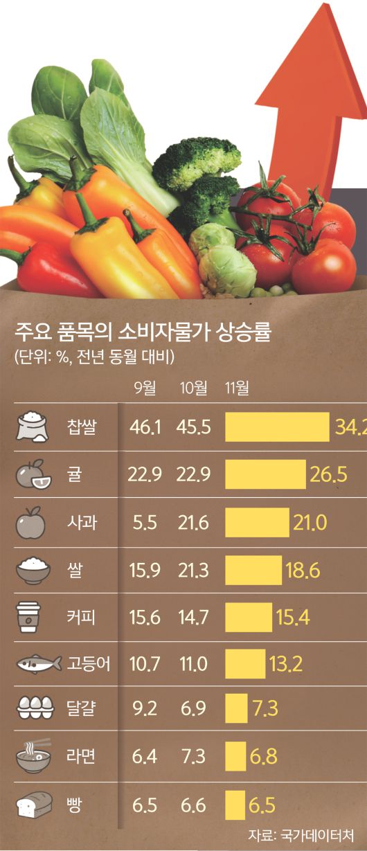 주요 품목별로 보면 겨울철에 수요가 몰리는 귤은 지난달 가격이 전년 대비 26.5%나 뛰었다. 사과 역시 21.0% 오르며 값이 고공행진 중이다. 하반기 들어 치솟은 쌀값은 수확철이 지나며 안정됐으나, 여전히 지난해보다 18.6% 높은 가격이다. 라면(6.8%)과 빵(6.5%)처럼 대중적인 먹거리 역시 가격이 오름세를 보이고 있다.