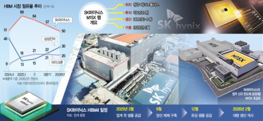 금융투자 업계는 HBM4 최초 양산과 HBM3E 증산 전략으로 내년에도 SK하이닉스의 시장점유율이 50%를 넘을 것으로 예측하고 있다. 삼성전자는 30%대, 마이크론은 20% 내외에 그칠 것으로 보인다. 특히 내년 4분기 엔비디아의 차세대 AI 가속기 루빈 출시와 맞물려 SK하이닉스의 HBM4 공급이 대폭 늘어날 가능성이 높다. SK하이닉스는 내년 2월 HBM4 양산과 5월 M15X 가동을 시작하며 HBM 1등 지위를 굳히겠다는 구상이다. 업계 관계자는 “HBM 시장은 이제 단순한 기술 경쟁을 넘어 안정적인 공급 역량이 핵심 경쟁력이 되는 2라운드에 진입했다”며 “내년 2월 HBM4 양산과 5월 M15X 가동은 SK하이닉스가 ‘1등’ 자리를 굳히는 분수령이 될 것”이라고 전망했다.