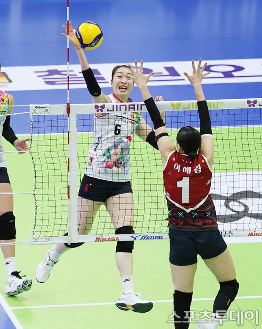[수원(경기)=스포츠투데이 권광일 기자] 2025-2026 진에어 V-리그 여자부 현대건설과 정관장의 경기가 25일 경기도 수원시 수원체육관에서 열렸다. 정관장 박은진이 공격을 하고 있다. 2025.12.25. [스포츠투데이 권광일 기자 sports@stoo.com]
