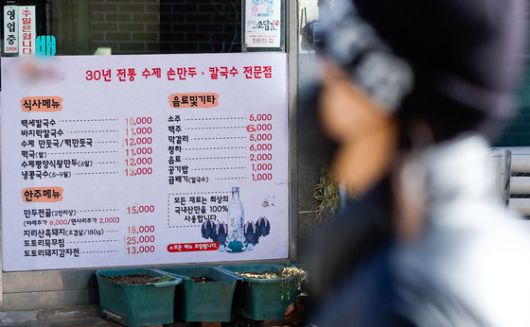 대표적 서민 외식 메뉴인 김밥·칼국수 가격이 서울 지역에서 1년 새 각각 5.7%, 4.9% 오른 25일 서울 시내 한 칼국수 집에 가격표가 붙어 있다. 뉴스1 |