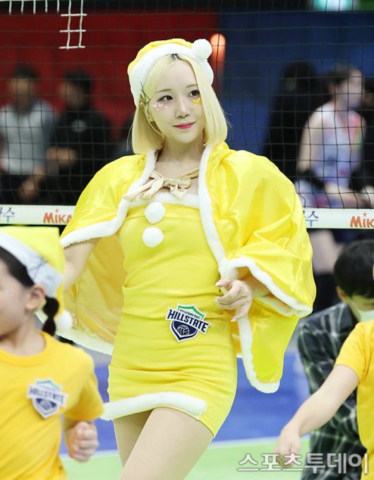 [수원(경기)=스포츠투데이 권광일 기자] 2025-2026 진에어 V-리그 여자부 현대건설과 정관장의 경기가 25일 경기도 수원시 수원체육관에서 열렸다. 치어리더 박성은이 산타걸 복장으로 응원을 선보이고 있다. 2025.12.25. [스포츠투데이 권광일 기자 sports@stoo.com]