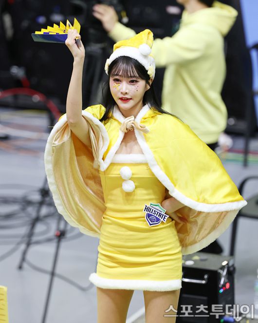 [수원(경기)=스포츠투데이 권광일 기자] 2025-2026 진에어 V-리그 여자부 현대건설과 정관장의 경기가 25일 경기도 수원시 수원체육관에서 열렸다. 치어리더 정가예가 산타걸 복장을 입고 응원을 선보이고 있다. 2025.12.25. [스포츠투데이 권광일 기자 sports@stoo.com]