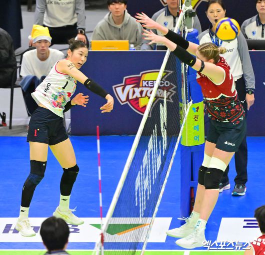 정관장도 힘을 냈다. 2세트 21-24에서 자네테의 오픈, 박혜민의 퀵오픈, 박혜민의 블로킹으로 3득점하면서 승부를 듀스까지 끌고 갔다. 24-24에서는 자네테가 서브득점을 올렸고, 25-24에서 이예림의 범실로 2세트가 마무리됐다.