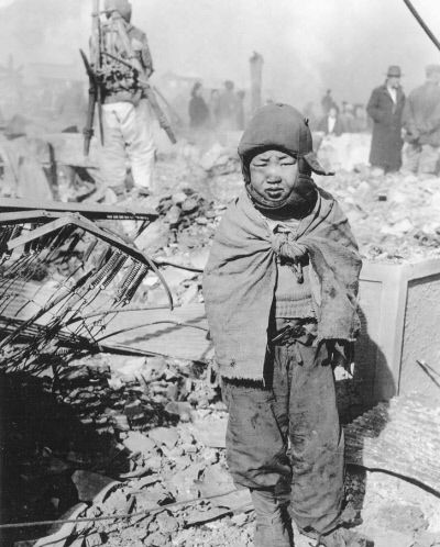 한국전쟁 시기 한 어린이가 폐허가 된 집터 위에 서 있다. 미국 국립문서기록관리청 소장 자료다. 도서출판 동녘 제공