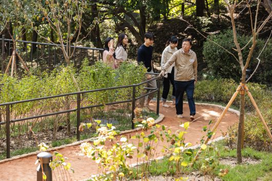 김경호 광진구청장과 구민들이 아차산 어울림 정원 산책로를 따라 걷고 있다. 아차산에는 맨발 산책로와 아차산 여가센터도 있다. |