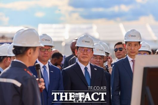 이재명 대통령이 8월 26일(현지시간) 미국 필라델피아의 한화 필리조선소를 시찰하며 관계자의 설명을 듣고 있다. /대통령실 |