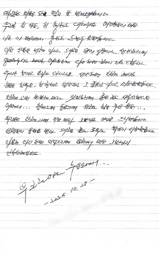 우크라이나군에 생포된 북한군 포로 2명이 귀순 의사를 담아 쓴 자필 편지. 2025년 10월 28일 작성된 것으로 보이는 이 편지에는 “우리는 절대로 혼자가 아니라고 생각하며 한국에 계시는 분들을 친부모, 친형제로 생각하고 그 품속으로 가기로 마음먹었다”고 적혀 있다. /겨레얼통일연대 |