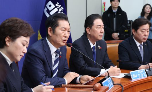 정청래 더불어민주당 대표(왼쪽 두번째)가 지난 24일 국회에서 열린 최고위원회의에서 발언하고 있다. 뉴스1