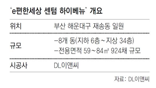 DL이앤씨는 부산 해운대구 재송동 일원에서 재송 2구역 재건축 사업을 통해 ‘e편한세상 센텀 하이베뉴’를 분양할 예정이라고 25일 밝혔다. 8개 동(지하 6층∼지상 34층) 전용면적 59∼84㎡ 924채 규모로 조성된다. 이 중 일반분양으로는 전용 59㎡ A타입 166채가 나올 예정이다.