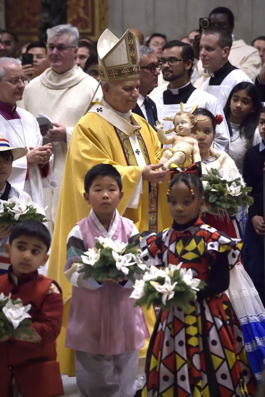 24일(현지시간) 즉위 후 첫 성탄 전야 미사를 집전하고 있는 교황 레오 14세(관을 쓴 인물)와 한복을 입은 어린이. [UPI=연합뉴스] |