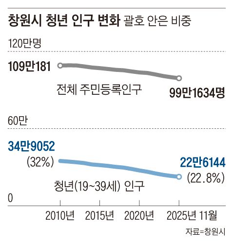 청년이 빠져나가면서 2010년 109만181명이었던 창원의 주민등록인구는 지난달 99만1634명으로 줄었다. 지난해 이미 100만명 선이 붕괴됐다.
