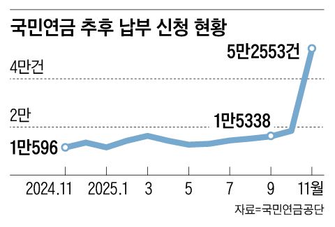 25일 본지 취재를 종합하면 A씨처럼 지난달 국민연금공단에 추납 신청을 한 사람이 5만2553명에 달한 것으로 나타났다. 지난해 11월(1만596명)보다 5배 가량 늘어난 수치다. 추후 납부 신청은 매달 1만~1만5000명 수준이었는데, 올 하반기 차츰 늘어나다가 11월에 폭증했다. 공단 관계자는 “지사마다 추납 신청하러 온 사람들로 북새통을 이뤘다”고 했다.