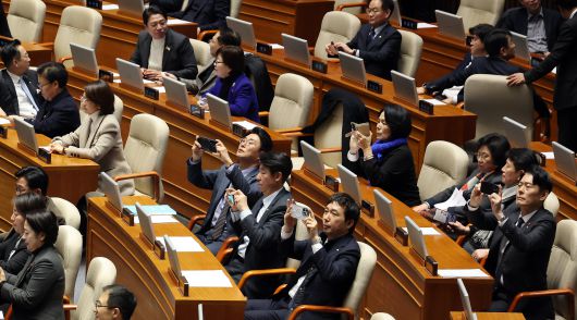 24일 국회에서 열린 12월 임시국회 본회의에서 '정보통신망 이용촉진 및 정보보호 등에 관한 법률 일부개정법률안(대안) 수정안'이 가결되자 더불어민주당 의원들이 휴대전화 카메라로 사진을 찍고 있다./연합뉴스 |