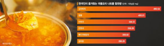 특히 국밥과 찌개류는 '국물을 남기면 괜찮다'는 인식과 달리, 이미 음식 자체에 많은 나트륨이 배어 있다. 나트륨 섭취의 적정 기준은 식품 100g당 120mg 미만이지만 대부분의 국물요리는 이를 훨씬 초과한다. 나트륨 섭취가 늘면 갈증으로 인해 단 음식을 찾게 되고 이는 과체중과 비만으로 이어질 가능성도 높인다.