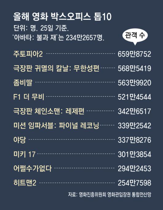 올해 한국 영화는 유독 존재감을 드러내지 못했다. 외화들이 선전한 덕에 연간 누적 관객 수 1억 명은 넘겼지만, ‘천만 영화’는 한 편도 없었다. 한국 영화 중 500만 관객을 돌파한 작품은 ‘좀비딸’ 한 편뿐이었다.