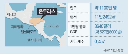 온두라스는 올 10월 국제통화기금(IMF) 기준 1인당 명목 국내총생산(GDP)이 3640달러(약 527만8000원)에 불과한 빈국이다. 특히 소득 불평등을 나타내는 지니 계수가 지난해 세계은행 기준 0.457로 세계 최상위권이다. 지니 계수는 0∼1 사이를 나타내며 1에 가까울수록 불평등이 심하다는 뜻이다. 개표 지연 등도 이런 경제 상황과 무관하지 않다.