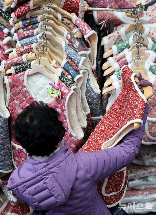 [대구=뉴시스] 이무열 기자 = 찬 공기 유입으로 기온이 크게 떨어진 22일 대구 중구 서문시장에서 한 시민이 두터운 조끼를 고르고 있다. 2025.12.22. lmy@newsis.com |
