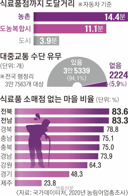 25일 국회입법조사처 보고서에 따르면 2020년 기준 전국 행정리 3만 7563곳 가운데 2만 7609곳(73.5%)에 식료품 소매점이 없다. 인근 식료품점까지의 접근성도 크게 떨어진다. 차로 이동하는 평균 시간은 농촌이 14.4분, 도시는 3.9분으로 농촌이 3.7배 더 걸린다. 행정리 2224곳(5.9%)은 대중교통조차 없다.