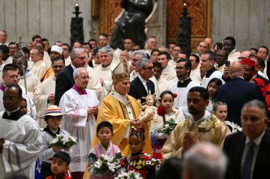 레오 14세(가운데) 교황이 24일(현지시간) 바티칸 성베드로대성당에서 성탄 전야 미사를 주재하던 중 미사 말미에 아기 예수상을 들어 보이고 있다. 교황은 성탄절이 거처가 없어 마굿간에서 태어난 예수 그리스도의 탄생을 축하하는 기독교 축일임을 강조하면서 도움이 필요한 이들을 외면하지 말라고 강조했다.