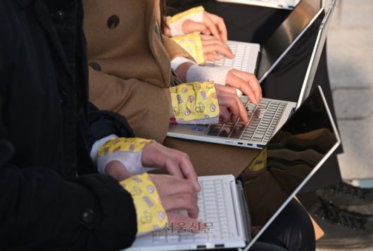 추위 속 국회 본청 앞 야외에서 손등에 핫팩을 붙이고 기자들이 나란히 앉아 노트북으로 기사를 작성하고 있습니다. 어떤 극한 환경에서도 독자에게 소식을 전하려는 기자 정신이 엿보입니다.