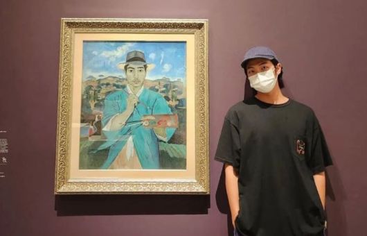 2022년 9월, 미국 LA 카운티미술관에서 열린 전시회에 방문한 BTS 멤버 RM이 ‘두루마기를 입은 자화상’ 옆에서 포즈를 취하고 있다. |