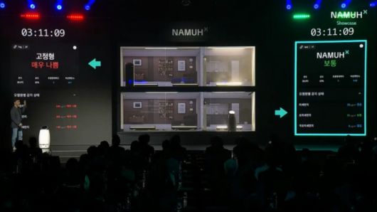 지난 4월 워커힐에서 열린 나무엑스 쇼케이스에서 공기청정 기능을 시연하고 있는 모습/사진=SK네트웍스 |