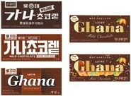 한편 가나 초콜릿은 품질 좋은 가나산 카카오 원두와 베네수엘라산 원두를 블렌딩해 만들어진다. 출시 당시부터 원료를 미립자 형태로 갈아내는 마이크로그라인딩 공법으로 부드러운 식감과 감미로운 향을 살린 것이 특징이다. 1996년부터는 BTC 공법을 도입해 품질을 한 단계 더 끌어올렸다.