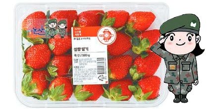 롯데마트가 논산·완주·담양·고령 등 7개 산지의 지자체 캐릭터를 스티커 형태로 부착한 연말 한정 패키지 ‘전국 딸기 대전’ 라인업을 선보인다. 사진은 ‘육군병장’ 캐릭터가 부착된 논산 설향 딸기 상품. [사진 롯데마트] |