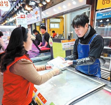 소상공인시장진흥공단 직원이 전통시장 상인을 대상으로 전통시장 화재공제를 설명하고 있다. [사진 소상공인시장진흥공단] |