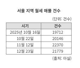 반대로 월세 매물은 빠르게 늘고 있다. 부동산 플랫폼 아실에 따르면 지난 23일 기준 서울 지역 월세 매물은 2만1779건으로 10월 16일 1만9712건 대비 10.5% 늘었다. 특히 강남, 한강벨트 지역 매물이 상당수를 차지한다. 이날 강남의 경우 매물 수는 6332건, 성동구 740건, 영등포구 625건, 마포구 572건이다.