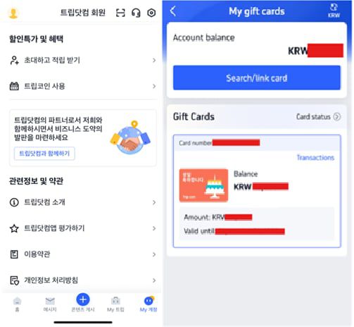(사진 왼쪽) 트립닷컴 앱을 한국어로 설정하면 기존에 보유하고 있던 기프트카드 잔액을 확인할 수 있는 메뉴가 사라져있다. (오른쪽) 다른 언어로 설정하면 확인할 수 있다./트립닷컴 모바일앱 캡처 |