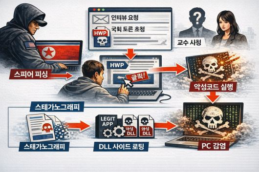 피해자가 메일에 담긴 HWP 파일을 내려받아 문서 속에 첨부된 하이퍼링크를 클릭하면 피해자의 PC가 악성 파일에 감염되는 방식으로 해킹이 이뤄졌다. APT37은 피해자가 링크를 클릭할 때 파일 다운로드 등 정상적인 절차가 시행되는 것처럼 교묘히 꾸며 해킹 의심을 피한 것으로 나타났다. 이 과정에서 해커는 정상 파일 내부에 악성 데이터를 은닉하는 ‘스테가노그래피’와 응용 프로그램 실행 과정에 악성 DLL을 함께 로딩시키는 ‘DLL 사이드 로딩’ 등 복합 기법을 활용해, 보안 프로그램의 탐지를 피했다.