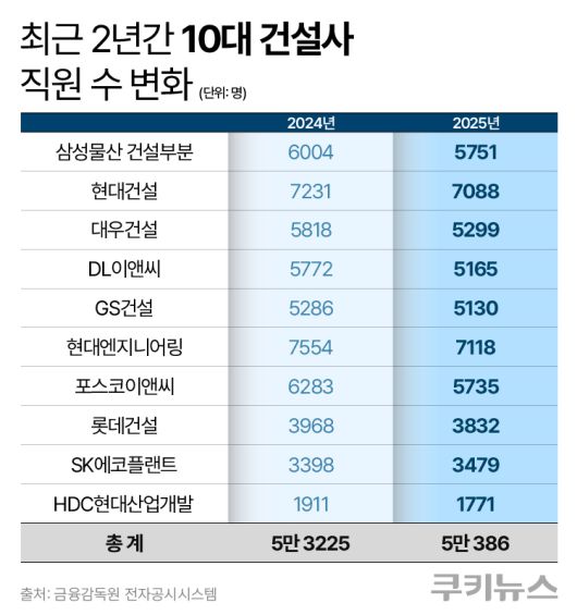 가장 큰 폭의 인력 감소를 기록한 곳은 DL이앤씨다. DL이앤씨의 임직원 수는 2024년 5772명에서 올해 5165명으로 줄어들며 1년 새 607명 감소했다. 이 밖에도 △삼성물산 건설부문(6004명→5751명) △현대건설(7231명→7088명) △대우건설(5818명→5299명) △GS건설(5286명→5130명) △현대엔지니어링(7554명→7118명) △포스코이앤씨(6283명→5753명) △롯데건설(3968명→3832명) △HDC현대산업개발(1911명→1771명) 등 대부분의 대형 건설사에서 인력 감소가 나타났다.