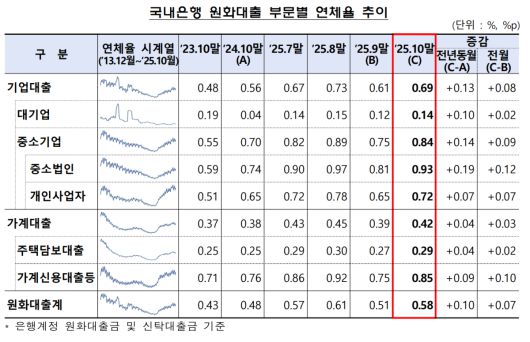 부문별로 보면 기업대출 연체율은 0.69%로 전월 말(0.61%)보다 0.08%p 올랐다. 대기업대출 연체율은 0.14%로 0.02%p 상승했고, 중소기업대출 연체율은 0.84%로 0.09%p 높아졌다. 이 가운데 중소법인 연체율은 0.93%로 전월 대비 0.12%p 상승했으며, 개인사업자대출 연체율도 0.72%로 0.07%p 올랐다.