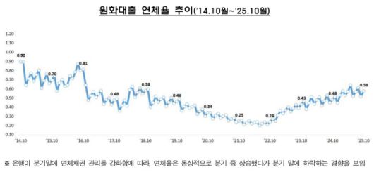 금융감독원은 10월말 국내은행의 원화대출 연체율(1개월이상 원리금 연체기준)은 0.58%로 전월말 0.51% 대비 0.07%포인트(p) 상승했다고 26일 밝혔다.