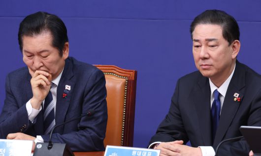 더불어민주당 정청래 대표(왼쪽), 김병기 원내대표가 24일 서울 여의도 국회에서 열린 최고위원회의에서 최고위원의 발언을 듣고 있다. 허정호 선임기자 |