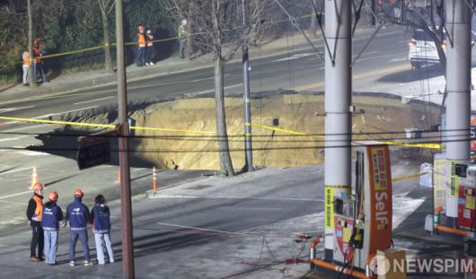 [서울=뉴스핌] 이호형 기자 = 24일 오후 서울 강동구 명일동 대명초등학교 인근 사거리에서 4차선 크기의 싱크홀(땅 꺼짐) 사고가 발생한 가운데 강동구 소방 당국이 만약의 추가 사태에 대비하고 있다. 소방 당국에 따르면 이 사고로 오토바이가 추락한 것으로 파악하고 있다. 2025.03.24 leemario@newspim.com |