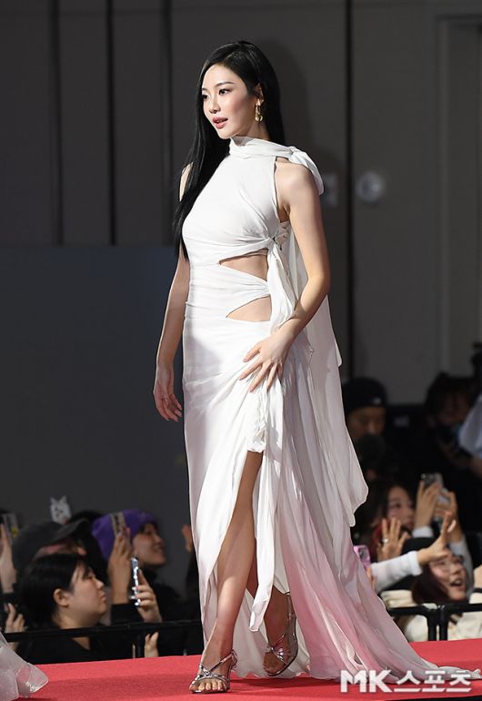 반면 카리나는 길이를 극대화했다. 스트랩과 컷아웃이 들어간 화이트 드레스는 허리선을 끊지 않으면서 아래로 자연스럽게 흐르며 다리를 강조했다. 군더더기 없는 직선 실루엣과 슬릿 디테일은 걸음을 옮길 때마다 체감 키를 더욱 길게 만들었다. 헤어 역시 스트레이트로 정리해 수직 이미지를 강화했고, 메이크업은 힘을 빼 드레스의 구조가 먼저 보이도록 했다. 168cm라는 신체 조건이 스타일링과 만나 가장 직관적으로 전달된 순간이었다.