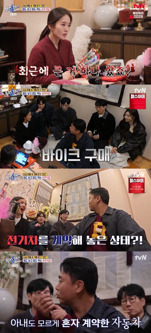 본격적인 점사가 이어지자 무당은 “최근에 큰 거 하나 샀지 않느냐. 입거나 타면 안 될 것 같다”고 말했고, 곽범은 잠시 망설이다가 “바이크를 하나 샀다”고 밝혔다. 이에 무당은 “그것보다 더 큰 게 있는 것 같은데?”라고 덧붙였고, 곽범은 “계약해 둔 전기차가 있다”고 털어놨다. 무당은 “그건 사면 정말 안 좋을 것 같다”고 단호하게 말해 긴장감을 자아냈다.