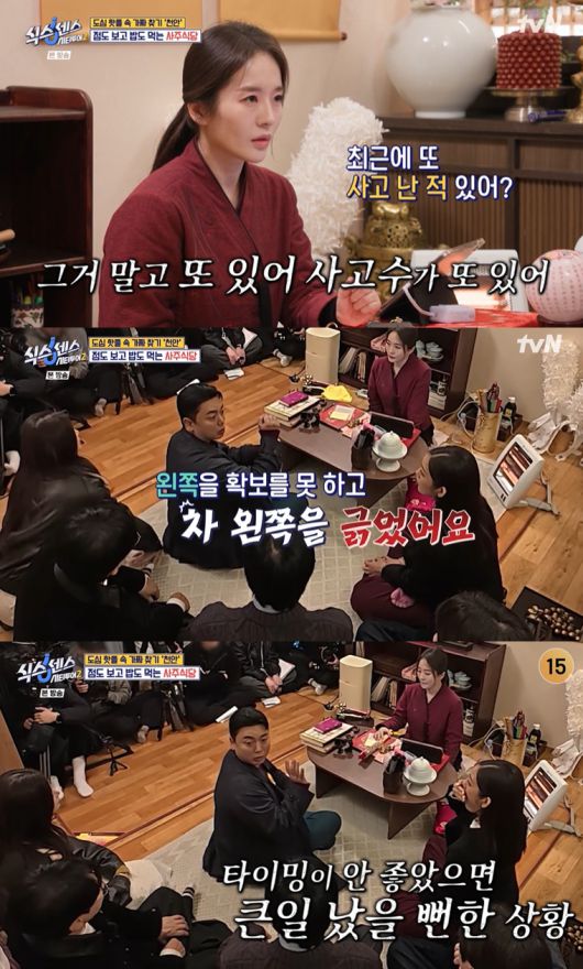 이날 멤버들은 점도 보고 식사도 할 수 있는 사주 식당을 찾았다. 해당 식당은 2층에서 점을 보고, 1층에서는 사주를 참고해 백반을 제공하는 곳으로 소개됐다. 무속인은 “신들린 건 2023년 8월”이라고 말했고, 이를 들은 출연진들은 “가장 신기운이 좋을 때”라며 술렁였다.