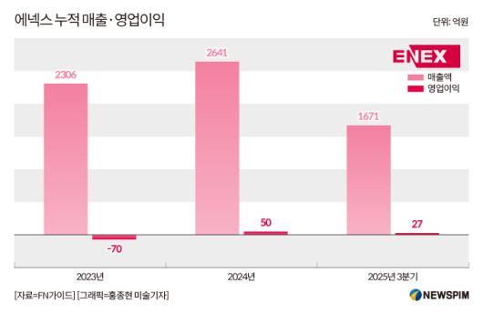 26일 업계에 따르면 에넥스는 올해 3분기 누적 기준 영업이익 27억원을 기록하며 어렵게 흑자 기조를 이어가고 있다. 다만 3분기 단일 기준으로는 5억 원의 영업적자를 내며 실적 개선 흐름이 다소 주춤한 모습이다. 이에 따라 연간 기준으로 흑자 기조를 지속할 수 있을지에 대해서는 신중한 관측이 나온다.